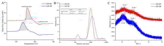 (A) DSC curves of SPs; (B) particle size of SPs; (C) XRD spectra of SPs.
