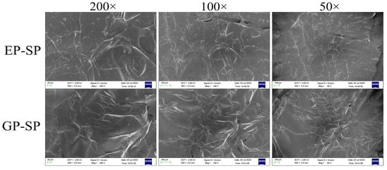 SEM images revealed aggregated sheet-like structures with smooth surfaces in both EP-SP and GP-SP at magnifications of 50×, 100×, and 200× (Figure 3). The relatively smooth morphology may be attributed to higher neutral sugar content [49]. These findings confirm that planting systems did not significantly alter the morphological characteristics of SPs.
