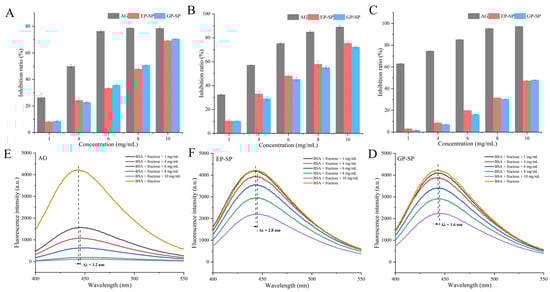 (A) Fructosamine inhibition of SPs; (B) α-dicarbonyl compound inhibition of SPs; (C) AGE inhibition of SPs; (D–F) fluorescence emission spectra of BSA in the BSA–fructose reaction model in the presence of different concentrations of AG, EP-SP, and GP-SP.