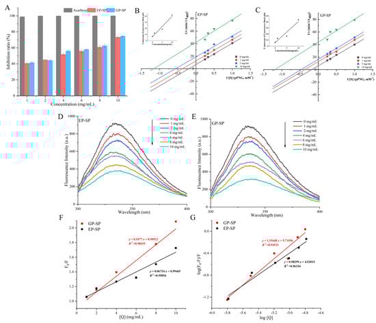 α-glucosidase inhibitory activity of EP-SP and GP-SP (A); Lineweaver–Burk plots of α-glucosidase inhibition by SPs and the linear relationship between the Y-intercepts of the Lineweaver–Burk plots and SP concentration (B,C); fluorescence emission spectra α-glucosidase in the presence of various concentrations of SPs (D,E); Stern–Volmer plots of α-glucosidase fluorescence quenching by SPs (F); plots of log [(F0 − F)/F] versus log [Q] for the interaction of SPs and α-glucosidase (G).