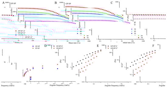 It is necessary to identify the linear viscoelastic region (LVR) before measuring oscillatory rheological properties to prevent sample disruption [72]. As shown in Figure 6C, the storage modulus (G′) and loss modulus (G″) remained constant within the LVR but decreased upon exceeding the critical strain (γc), reflecting permanent alterations in the intermolecular network [71]. Therefore, a 1% strain was selected to study the dynamic rheological properties of the two SPs.