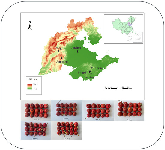 The hawthorn variety investigated was Crataegus pinnatifida Bunge var. major (“Dawuleng”). Fully mature fruits were manually harvested in October 2023 from six locations across China, encompassing diverse altitudes, as follows: JZ (Jinzhou, 47 m), FX (Feixian, 168 m), MY (Mengyin, 211 m), PY (Pingyi, 225 m), JX (Jiangxian, 842 m), and TG (Taigu, 1098 m). The sampling sites selected involved three large hawthorn growing provinces: Shandong, Hebei, and Shanxi. Subsequently, the samples were transported under controlled conditions of 4 °C to ensure their preservation and integrity for subsequent analysis. Specific sample information is presented in Table S1 and Figure 1.