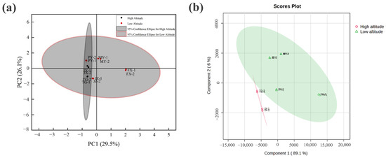 Multivariate analysis of high- and low-altitude samples: (a) PCA score plot and (b) PLS-DA score plot.