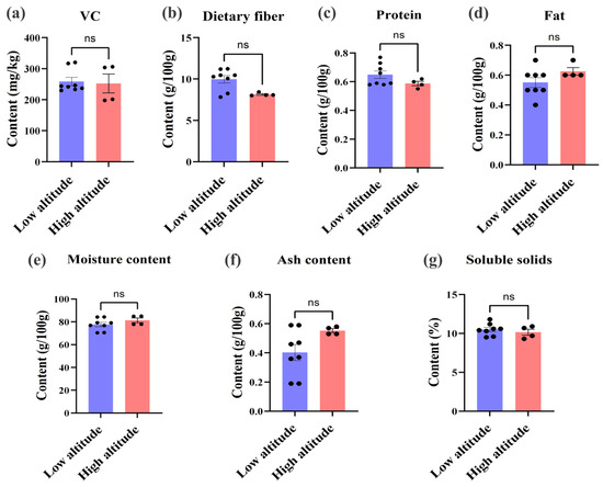 The effect of altitude on seven essential nutrients in hawthorn: (a) VC, (b) dietary fiber, (c) protein, (d) fat, (e) moisture content, (f) ash content, (g) soluble solids. Note: ns indicates no significant difference (p > 0.05).
