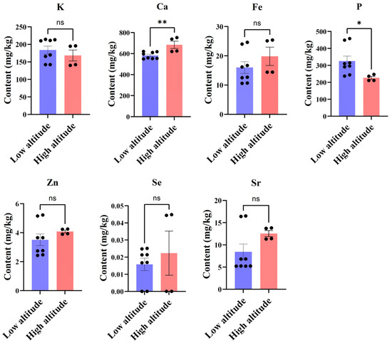 Descriptive analysis of seven trace elements in hawthorn at different altitudes. Note: * p < 0.05, ** p < 0.01, ns: No significant difference (p > 0.05).