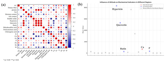 Overall, the distribution of nutritional indicators exhibited significant variations between high- and low-altitude samples (Figure 6b). Calcium content was notably elevated at higher altitudes, reflecting the influence of environmental factors such as reduced oxygen levels and climatic stress. Conversely, hypericin, quercetin, rutin, and phosphorus were found to be significantly more abundant at lower altitudes, likely driven by disparities in temperature, humidity, and other environmental conditions. Potassium, iron, zinc selenium, and strontium did not display significant differences between altitudes, thus indicating their stability and minimal susceptibility to environmental fluctuations. These findings comprehensively summarize altitude-dependent distribution patterns and correlations among all analyzed indicators.
