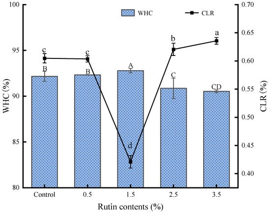 Effects of pre-emulsified linseed oil containing rutin on the water holding capacity (WHC) and cooking loss rate (CLR) of tapioca starch-Nemipterus virgatus surimi composite gels. A–D: different letters indicate differences in WHC; a–d: different letters indicate differences in CLR.