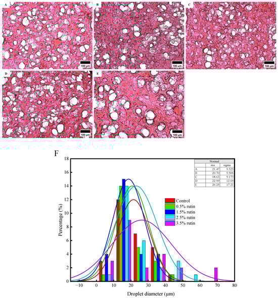 Effects of pre-emulsified flaxseed oil containing rutin on the compactness (A–E) and cavity diameter (F) of surimi gel determined by light microscopic images (200×). A is the control group without rutin, and B–E are samples with 0.5%, 1.5%, 2.5%, and 3.5% of rutin (dissolved in flaxseed oil, w/v), respectively.