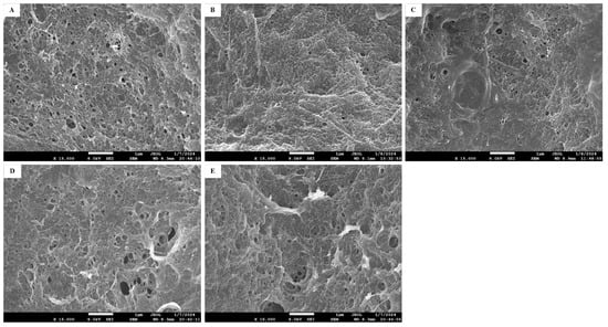 The quality of surimi products correlates with protein structure, and microstructure reflects gelatinization during heating. Figure 3 illustrates the microstructure of the control gel (without rutin) (A) and gels with 0.50% (B), 1.50% (C), 2.5% (D), and 3.50% (E) rutin. The control group exhibited dense small pores with a rough surface. Gels containing 0.5% and 1.5% rutin exhibited finer, more continuous matrices with improved flatness (Figure 3B,C). This suggests that rutin promotes protein cross-linking, forming dense filaments that polymerize into a fibrous gel network [28]. Phenolic compounds like rutin can cross-link with proteins through hydrophobic interactions and hydrogen bonding, forming a dense network structure [32]. However, concentrations above 1.5% resulted in larger pores in the microstructure (Figure 3D,E), consistent with reduced gel strength, chewiness, and WHC. Balange and Benjakul [28] concluded that high levels of phenolic compounds lead to self-aggregation, impairing protein cross-linking ability and gel network formation.
