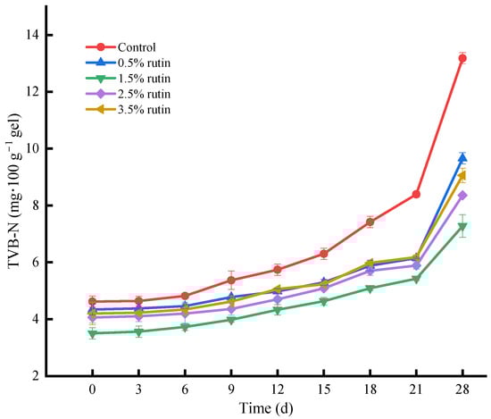 The TVB-N value is a key indicator of aquatic product freshness [33]. Figure 4 illustrates the TVB-N content changes in surimi gel during refrigeration with rutin addition. TVB-N content increased over time across all groups. Rutin significantly inhibited volatile basic nitrogen production, especially in the 1.5% rutin gel group, where TVB-N decreased from 13.18 mg/100 g to 7.28 mg/100 g by the 28th day, indicating the most effective inhibitory effect. Microbial growth leads to protein breakdown into amino acids, producing alkaline nitrogenous substances that elevate TVB-N levels [23]. Rutin effectively inhibits the oxidation of pre-emulsified flaxseed oil and the decomposition of surimi protein. The control group’s TVB-N value rose significantly after 6 days, likely due to rapid enzymatic hydrolysis from oil oxidation, which releases ammonia and other alkaline nitrogen compounds. The antibacterial and antioxidant properties of rutin can inhibit protein decomposition and microbial growth [34]. Notably, the TVB-N content in all groups remained below the national standard of 30 mg/100 g after 28 days of refrigeration.