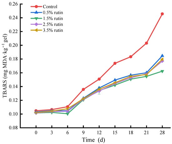 Malondialdehyde (MDA) is a primary indicator of lipid oxidation. As shown in Figure 5, MDA content in each group remained stable until the sixth day, then increased significantly, likely due to the decomposition of hydroperoxides into secondary oxidation products [14]. Surimi gels with rutin began to exhibit lipid oxidation inhibition at this point. The addition of tea polyphenols has also been effective in inhibiting lipid oxidation [35]. Notably, 1.5% rutin significantly inhibited lipid oxidation after the third day, with MDA content lower than that of the control group without rutin after 28 days. Rutin and ruttyl ester have been reported to inhibit the decomposition of hydroperoxides into secondary oxidation products [36]. This study demonstrated that rutin effectively maintains low MDA levels, with the most significant antioxidant effect observed at a 1.5% concentration.