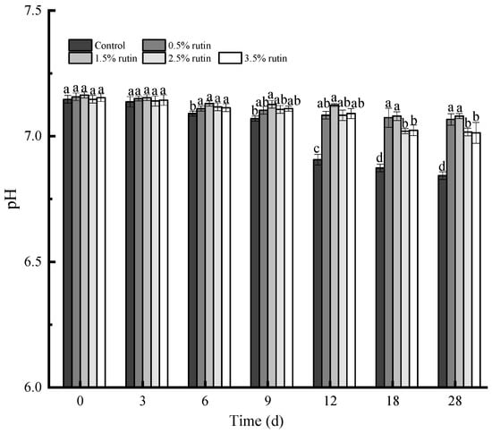 Effects of pre-emulsified flaxseed oil containing rutin on the pH value of tapioca starch–Nemipterus virgatus surimi composite gels during 28 days storage. a–d: different letters indicate differences in pH.