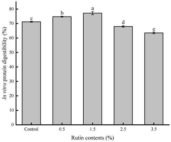 Surimi gel is rich in high-quality proteins, making its digestibility crucial for gastrointestinal nutrient release [20]. Protein digestibility reflects the extent of surimi protein digestion in the human gastrointestinal tract, with rutin’s effect observed through levels of protein digestion. Compared with the control group, surimi gel protein digestibility initially increased and then decreased with varying rutin concentrations (Figure 7). Notably, at 1.5% rutin, protein digestibility reached 77.18%. Beyond this concentration, digestibility dropped to a minimum of 63.42%. These results suggest that rutin can enhance surimi protein digestion within a certain dosage range. However, exceeding this threshold may hinder absorption and utilization. Appropriate rutin levels can expand the protein molecular structure, promoting covalent cross-linking that facilitates enzymatic digestion by pepsin [41]. Conversely, higher phenolic compound concentrations may resist hydrolysis and protease digestion [42]. Surimi protein in the control group, without rutin, is prone to oxidation, which may impair binding to digestive enzymes and reduce digestibility [43].