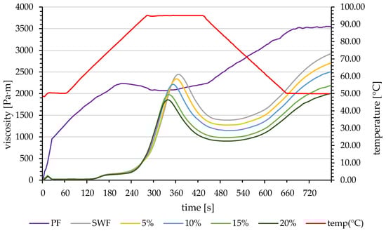 The control sample (pure SWF) showed a typical wheat starch gelatinization profile, with a sharp viscosity increase beginning around 67–73 s as the temperature approached 65–70 °C. This initial rapid viscosity development led to a well-defined peak viscosity of approximately 2500 mPa·s, reflecting maximum starch granule swelling. Several systematic changes were observed as PF concentration increased from 5% to 20%. There was a progressive reduction in peak viscosity, with each increment of PF resulting in lower maximum viscosity values. The onset of gelatinization was slightly delayed, particularly noticeable at higher PF concentrations. The samples also showed reduced holding strength during the constant-temperature phase (95 °C) and lower final viscosities during the cooling phase, indicating reduced retrogradation tendency.