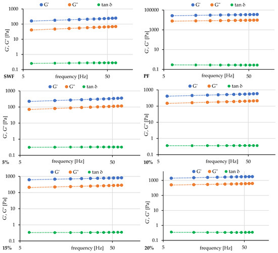 Frequency sweep profiles of pumpkin flour/soft wheat blends. SWF—soft wheat flour; PF—pumpkin flour; 5–20%—pumpkin flour addition.