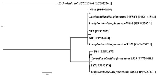 Five selected LAB isolates were identified using 16S rRNA gene sequence analysis. The similarity of the DNA sequences was determined using the NCBI-BLAST database, and the results are shown in Table 2. In this study, three different species were classified: Lactiplantibacillus plantarum (formerly Lactobacillus plantarum, isolates NB1 from fermented buffalo meat and NP2 and NP11 from fermented pork meat), and Limosilactobacillus fermentum (formerly Lactobacillus fermentum, isolates PS4 and PS7 from fermented fish).