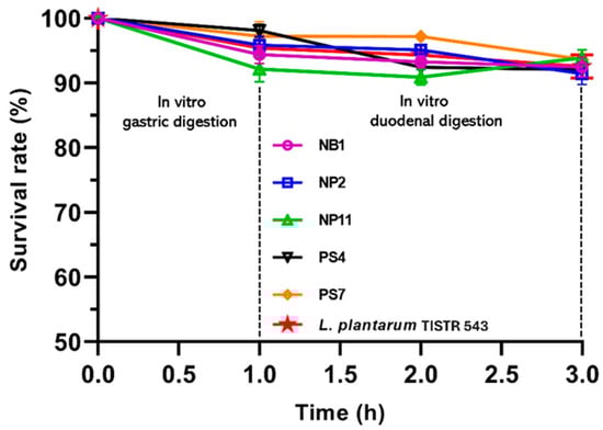 Survival of L. plantarum NB1, L. plantarum NP2, L. plantarum NP11, L. fermentum PS4, and L. fermentum PS7 under in vitro gastric and duodenal digestion conditions. L. plantarum TISTR 543 was used as the probiotic reference strain.
