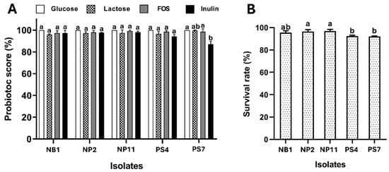 Probiotic scores (A) and survivability after lyophilization (B) of L. plantarum NB1, L. plantarum NP2, L. plantarum NP11, L. fermentum PS4, and L. fermentum PS7. Statistically significant differences (p < 0.05) between strains are indicated by different lowercase letters (a,b).