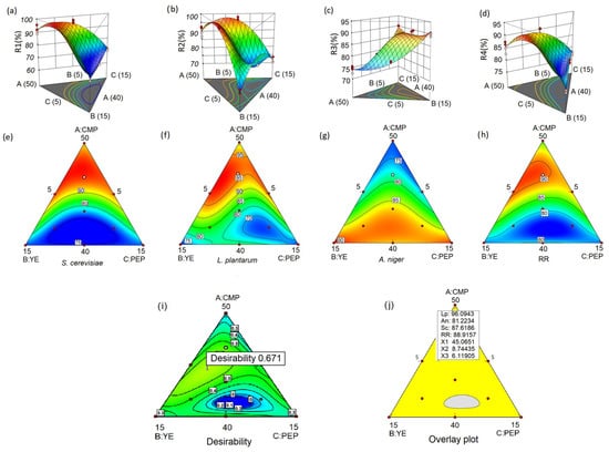 Response surface and contour of recovery rate. R1: S. cerevisiae (a,e); R2: L plantarum (b,f); R3: A. niger (c,g); and R4: RR (d,h). The contour plot of maximum desirability (i) and overlaid graph represented by different regions indicating maximum (yellow areas) and minimum (gray areas) (j). The optimum values of the ingredients and the four recovery rates are shown as a flag planted. The gradient colors (red-green-blue) indicate different levels of responses: red indicates areas with the highest values, green represents intermediate values, and blue indicates areas with the lowest values. Contour lines delimit areas with the same response value, with each line corresponding to a constant value, allowing to visualize how responses vary within the experimental space.