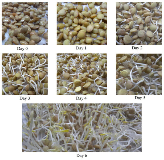 Lentil seeds (Lens esculenta) were purchased from a local market in Shiraz, Iran. All seeds were washed with distilled water to remove impurities. The germination process was performed following the procedure described by Fouad and Rehab (2015) [14] with slight modifications. The lentil seeds were soaked in distilled water at a ratio of 1:10 (w/v) overnight. The water from this soaking was then discarded, and the seeds were wrapped using a wet cotton cloth and kept in dark conditions. The seeds were irrigated daily with fresh distilled water for 6 days and the cotyledon emergence dynamics and changes during that period can be appreciated in Figure 1. Samples were selected at 1-day intervals and frozen at −20 °C to cease germination. After thawing, the samples were oven-dried (50 °C, 6 h) and grinded (Kyocera, CM-20C SF, Kyoto, Japan). All samples were vacuum packed and stored at −20 °C for further analyses according to the experimental plan detailed in Figure 2.