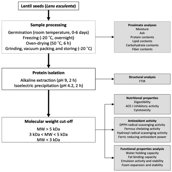 This study investigated the nutritional, physicochemical, and functional changes in lentil proteins extracted from seeds during a 6-day germination period. The proximate composition of lentils (moisture, protein, lipid, carbohydrate, and fiber contents) and changes in their structure—measured by Fourier transform infrared (FTIR) analysis—were determined during the 6-day germination period. Moreover, fractions of variable MW were generated from all the protein isolates during all stages of germination to examine their digestibility, antioxidant activity (DPPH radical scavenging, ferrous chelating activity, hydroxyl radical scavenging activity, and ferric reducing antioxidant power), cytotoxicity (L929 cells), and functional properties (water/oil binding capacity and emulsifying and foaming properties) to provide a complete perspective of the changes induced by lentil proteins during the process of germination that could have an impact for the development of value-added products from different seed sprouts in the food industry.