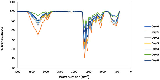 FTIR spectra of protein isolates generated from lentil seeds during germination (days 0–6). Results were recorded three times for each sample.