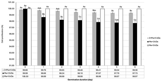 The effect of protein isolates of different MW fractions achieved from protein isolates from lentils in different germination stages on the proliferation of L929 cells is represented in Figure 4. The cytotoxicity of the samples was affected by the germination (p < 0.001; F = 192.555), MW purification (p < 0.001; F = 2960.312), and the interaction between both factors (germination*MW; p < 0.001; F = 101.532). Protein fractions of MW < 3 kDa and 3 kDa < MW < 5 kDa showed significant adverse effects. The cell proliferation remained unchanged in the presence of high-MW protein fractions (MW > 5 kDa) during the sprouting process. The lowest cell proliferation of the L929 cell line (97.63%) was related to the treatment with the MW < 3 kDa lentil protein fraction after 6 days of germination. Meaningful differences were appreciated among cell lines treated with different MW fractions achieved during germination and thus the germination process had a toxicity effect of MW < 3 kDa and 3 kDa < MW < 5 kDa fractions on normal L929 cells.