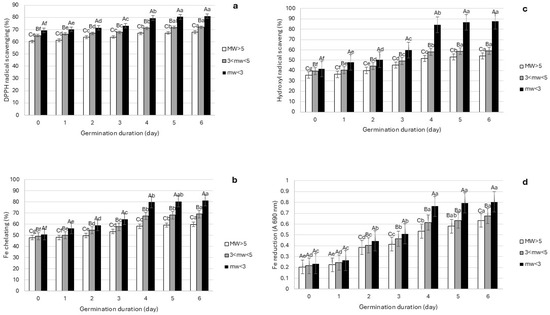 Antioxidant activities: (a) DPPH (%), (b) Fe chelating (%), (c) hydroxyl radical (%), and (d) FRAP (A) activities of different MW fractions achieved from protein isolates from lentils during process of germination (days 0–6). Different uppercase letters indicate statistically significant differences (p < 0.05) in antioxidant activity between fractions of different MW within same germination day. Lowercase letters indicate statistically significant (p < 0.05) differences in antioxidant activity between different germination days at same MW. Data are shown as average of two replicates.