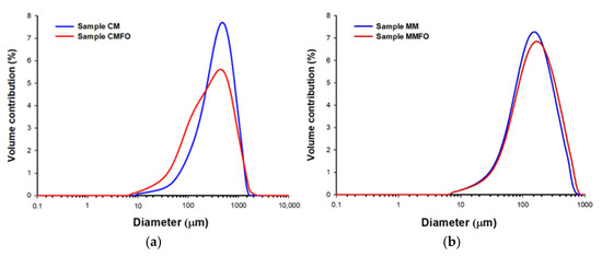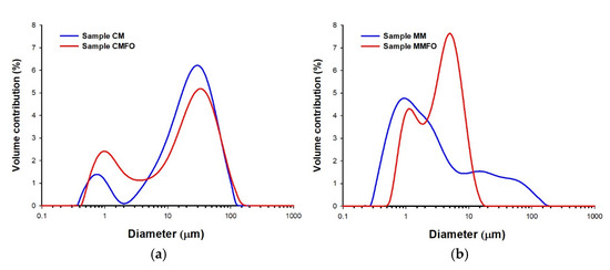 The size distribution of the particles (PSD) was determined using a Mastersizer 2000 analyzer (Malvern Instruments Ltd., Malvern, UK), which is based on the laser diffraction method. Both measurements were carried out using the wet method with a Hydro 2000 G unit equipped with a high-speed stirrer and an ultrasonic source. In the PSD measurement of the powders, isopropanol was used as the dispersant, while the PSD measurement of the emulsion droplets was carried out in the prepared emulsion of reconstituted milk products, where water was used as the dispersant. After preparation of reconstituted freeze-dried milk product samples (methodology described in