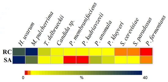 Yeast strains analyzed in this study (M. pulcherrima SA-5-25.1, SA-5-25.3, SA-7-70, RC-2-2, RC-6-27, RC-6-67; H. uvarum SA-4-20, SA-4-33, SA-4-52, RC-4-4, RC-6-36, RC-4-46; S. paradoxus SA-4-10, SA-7-12, SA-5-26, RC-2-17, RC-8-28, RC-2-40; S. cerevisiae SA-5-8, SA-6-60, SA-N4, RC-3-11, RC-7-34, RC-8-64; P. anomala SA-4-39, RC-8-20, RC-2-63; P. kluyveri SA-7-30, SA-4-48, RC-6-31; T. delbrueckii RC-2-70, RC-2-72, RC-7-72) and were isolated from the spontaneous fermentation of rosehips (RC—Rosa canina L.) and rowanberries (SA—Sorbus aucuparia L.). Other yeasts were used for the killer assay and biocontrol experiment in grape juice: S. cerevisiae strain α’1 (MATα leu2-2 (Kil-0)), K7 (MATα arg9 (KIL-K1)), M437 (wt, HM/HM (KIL-K2)), MS300 (MATα leu2 ura 3-52 (KIL-K28)) [45] SRB-15-4 (wt, HM/HM (KIL-Klus)) (Nature Research Centre, collection of Laboratory of Genetics), S. paradoxus AML-15-66 [16], M. pulcherrima 2-34 (K+), 5-47 (K−), H. uvarum 3-8 (K−), 1-14 (K−), P. fermentans 4-36 (K+), 4-39 (K+), P. kluyveri 7-12 (K+), 6-57 (K+), P. membranifaciens 8-41 (K+), 8-47 (K+), T. delbrueckii 5-17 (K−), 1-61 (K−), Candida albicans 21.1, and P. anomala 7-13.5 (Nature Research Centre, collection of Laboratory of Genetics).