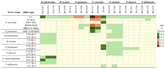 Killing phenotype observed in representative yeast strains. Tester strains were seeded as a lawn in MBA agar plates, and analyzed killer toxin-producing strains were spotted on this monolayer. Plates were grown at 25 °C for 2 days before measurements of growth inhibition zones were taken. Data represent the mean value from three plates.