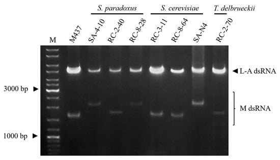 - Crabtree, A.M.; Taggart, N.T.; Lee, M.D.; Boyer, J.M.; Rowley, P.A. The Prevalence of Killer Yeasts and Double-Stranded RNAs in the Budding Yeast Saccharomyces cerevisiae. FEMS Yeast Res. 2023, 23, foad046. [Google Scholar] [CrossRef] [PubMed]