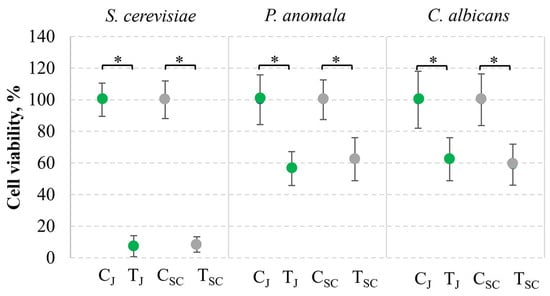 The viability of S. cerevisiae, P. anomala, and C. albicans yeast under the action of yeast killer toxin in grape juice (J) and medium (SC). C—control, yeast cells only; T—yeast cells incubated with killer toxin. Asterisks represent statistically significant differences (p ˂ 0.05) between the survival of tested microorganisms in the control and killer toxin-treated samples. Green color indicates juice samples, while gray—SC medium.