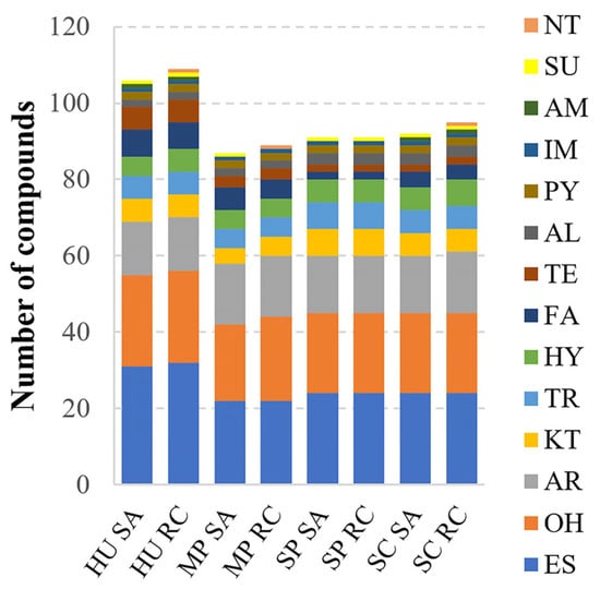 Chemical diversity of volatile organic compounds produced by yeasts. HU—H. uvarum, MP—M. pulcherrima, SP—S. paradoxus, SC—S. cerevisiae; SA—rowanberry (Sorbus aucuparia L.), RC—rosehip (Rosa canina L.). Functional group of volatiles: ES—ester, OH—alcohol, AR—aromatic, KT—ketone, TR—terpen, HY—hydrocarbon, FA—fatty acid, TE—terpenoid, AL—aldehyde, PY—pyrazine, IM—imine, AM—amide, SU—sulfide, NT—nitrile.