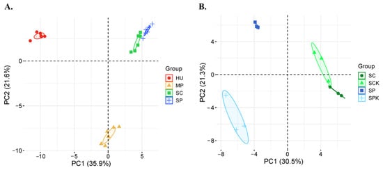 Yeast principal component analysis according to released volatile organic compounds. All tested yeast (A) and only Saccharomyces spp. strains (B). RC—rosehip, SA—rowanberry. K—killer yeast, K−—non-killer yeast. (A) HU—H. uvarum, MP—M. pulcherrima, SP—S. paradoxus, SC—S. cerevisiae; (B) SC, SP—non-killer yeasts, SCK, SPK—killer yeasts.