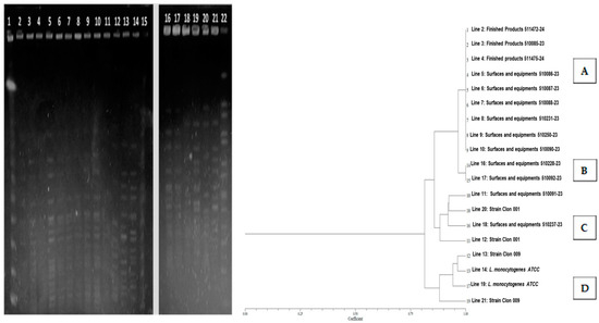 The 16 strains were characterized using PFGE, resulting in a correlation coefficient of 0.90406 (Figure 1). Additionally, one group of finished products (510085-23, 511472, and 511475-24) was identified, containing six closely related strains found in surfaces and equipment (510086-23, 510087-23, 510088-23, 510090-23, 510231-23, and 510250-23) (Group A). In contrast, the other two groups (B and C) exhibited greater variability and were not related to the strains isolated from finished products (Figure 1).