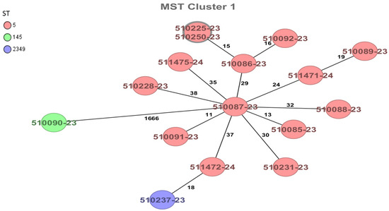 The minimum spanning tree (MST) of sixteen Listeria monocytogenes strains isolated from refrigerated foods and surfaces and equipment. The MST is calculated based on the defined cgMLST scheme [33], which comprises 1701 target genes for Listeria monocytogenes. Isolates are represented as colored circles according to the classical MLST, with black numbers indicating the allelic differences between isolates. Two isolates with closely related genotypes are marked as clusters.