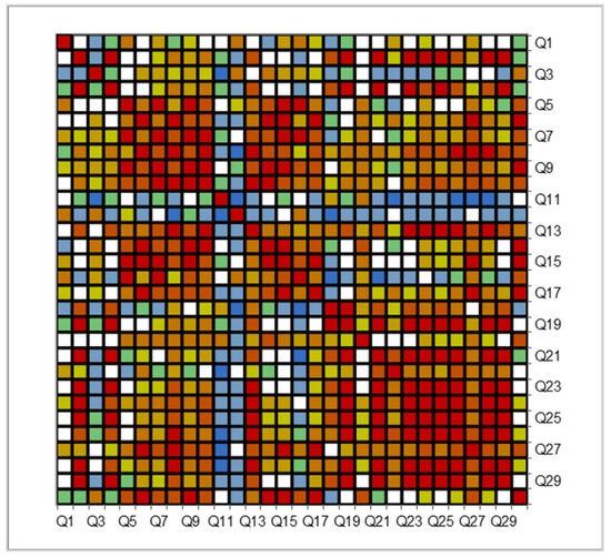 This analysis is detailed in the Supplementary Materials. The Cronbach’s alpha index value was 0.926, and the Guttman L1–L6 coefficients were 0.895–1.000. The correlation matrix, covariance matrix (Supplementary Materials), and high coefficients reveal the online questionnaire’s substantial reliability and appreciable internal consistency, thus confirming its high quality. The correlation map in Figure 1 shows that all questions are significantly intercorrelated.