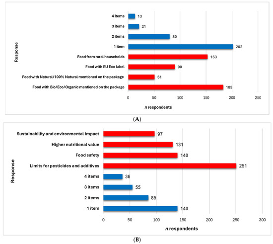 Honey and other healthy foods (n = 169, 53.48%), fish and meat (n = 109, 34.49%), and novel foods (chia seeds, protein powders, microalgae, noni, acai, etc., n = 80, 25.31%) are also important to consumers (p < 0.05, Figure 4B). Basic foods (oil, vinegar, flour, sugar, bread) and sweets are purchased less often in the eco version (n = 53 (14.48%) and n = 27, (7.37%), p < 0.05). Figure 4B also indicates that most respondents selected multiple (2–7) items (n = 258, 81.64%); only 18.35% (n = 58, p < 0.05) opted for only one item.