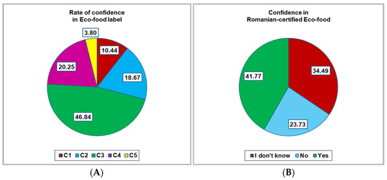 Over 45% of respondents expressed their confidence (C1–C5, C1—minimal, C5—maximal) in an eco-food label as a medium level (C3, 46.84%), while 41.77% have trust in Romanian-certified organic food (p > 0.05, Figure 3).