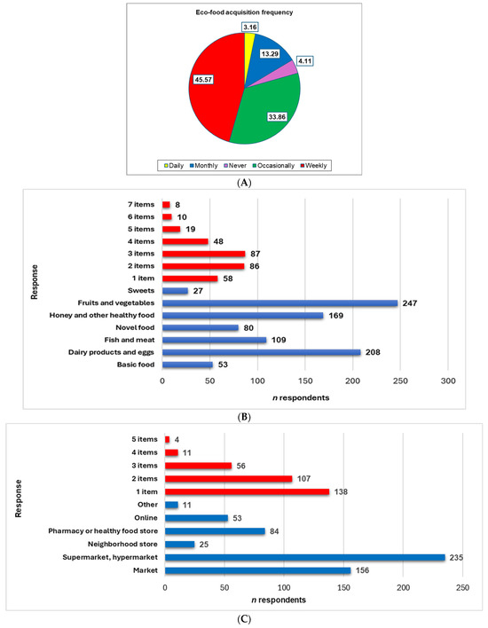 Three queries with multiple choices available, alone or associated, investigated the respondents’ preferences, motivations, and eco-food purchasing behavior (Figure 4B–D).