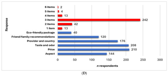 Price, taste, and odor are the most common criteria for eco-food acquisition (n > 200, Figure 4D). They are followed in decreasing order by provider and country (n = 176), aspect (n = 144), and friend/family recommendations (n = 120), while 40 respondents mention eco-friendly packages (p < 0.05). The data from Figure 4D also reveal that most participants (n = 303) selected multiple choices (2–6), while only 13 opted for one item (p < 0.05).