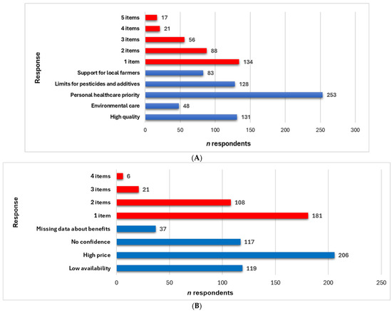 Two questions with multiple choices available, alone or associated, investigated the respondents’ motivations for purchasing or avoiding eco-food (Figure 5A,B).