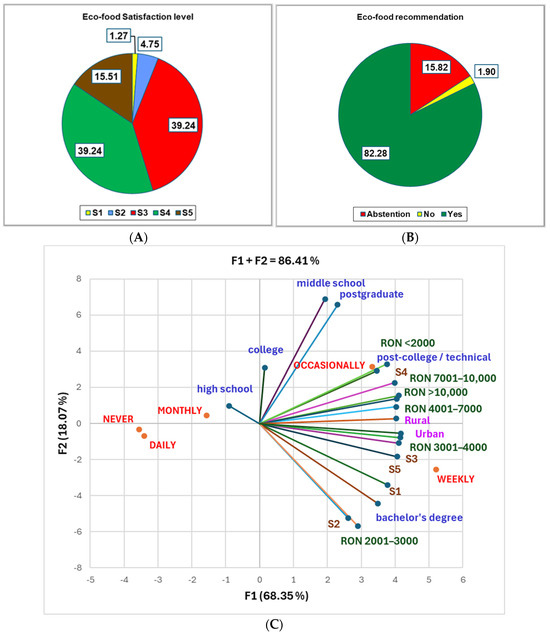 Many factors influence eco-food consumption behavior, leading to various acquisition frequencies, satisfaction levels (S1–S5; S1—minimal, S5—maximal), and potential eco-food recommendations (Figure 6A,B).