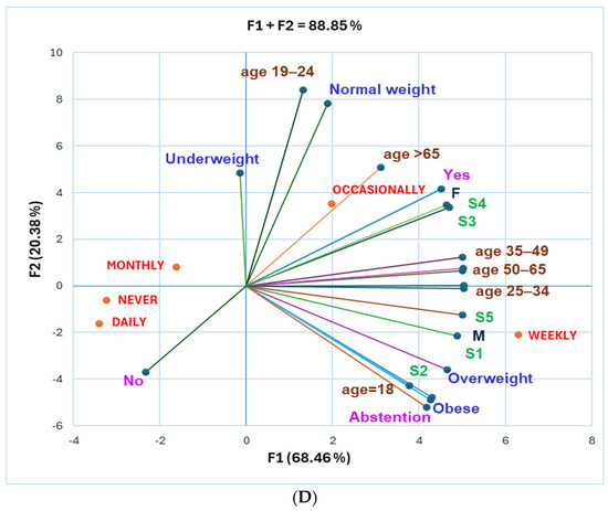The places of eco-food acquisition frequencies compared to all variable parameters are displayed in Figure 6C,D. A bachelor’s degree highly correlates with an income of RON 2001–3000 and RON 3001–4000/month, and S1, S3, and S5 (r = 0.887–0.989, p < 0.05), while a post-college degree is strongly associated with S4 (r = 0.888, p < 0.05, Figure 6C and Supplementary Materials—PCA2). A high correlation exists between ages 25–65 and both sexes, S1, S3–S5, and “yes” for eco-food recommendation (r = 0.892–0.991, p < 0.05, Figure 6D and Supplementary Materials—PCA3). Obesity and normal weight are strongly associated with males, age = 18, S1, and “abstention” for eco-food recommendation (r = 0.909–0.999, p < 0.05).