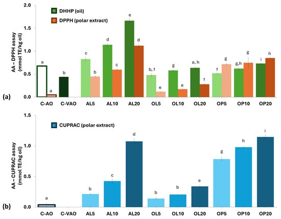 Antioxidant activity (AA) of oil samples, using both DPPH● (a) and CUPRAC (b) assays. C-AO = avocado oil; C-VAO = freshly extracted virgin avocado oil; AL5-AL10-AL20, OL5-OL10-OL20, and OP5-OP10-OP20 represent C-VAO enriched with avocado leaves, olive leaves, and olive pomace, respectively, at 5, 10, and 20% (w/w) employing ultrasound-assisted maceration. Results expressed as mean value ± standard deviation (n = 3). Darker colors per used plant material indicate higher enrichment levels. Different letters above the bars indicate significant differences (p < 0.05) within the whole sample population, per assay, employing Duncan’s test.