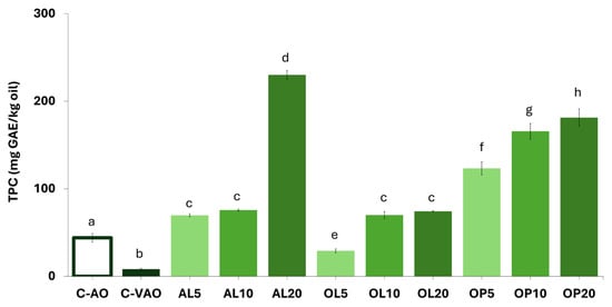 Total phenolic content (TPC) of oil samples. C-AO = avocado oil; C-VAO = freshly extracted virgin avocado oil; AL5-AL10-AL20, OL5-OL10-OL20, and OP5-OP10-OP20 represent C-VAO enriched with avocado leaves, olive leaves, and olive pomace, respectively, at 5, 10, and 20% (w/w) employing ultrasound-assisted maceration. Results expressed as mean value ± standard deviation (n = 3). Darker colors per used plant material indicate higher enrichment levels. Different letters above the bars indicate significant differences (p < 0.05) within the whole sample population employing Duncan’s test.