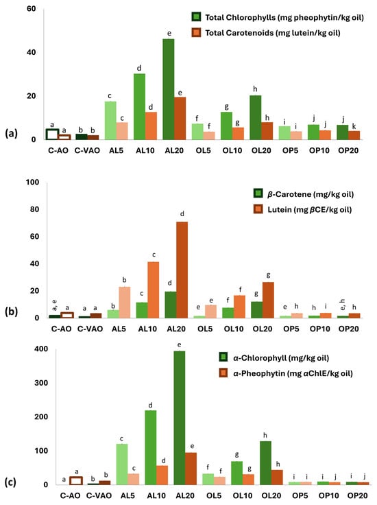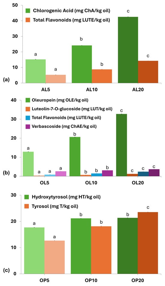 Phenolic content of oils enriched with (a) avocado leaves (AL), (b) olive leaves (OL), and (c) olive pomace (OP). AL5-AL10-AL20, OL5-OL10-OL20, and OP5-OP10-OP20 represent freshly extracted virgin avocado oil enriched with avocado leaves, olive leaves, and olive pomace, respectively, at 5, 10, and 20% (w/w) employing ultrasound-assisted maceration. Results expressed as mean value ± standard deviation (n = 3). Darker colors per used plant material indicate higher enrichment levels. Different letters above the bars indicate significant differences (p < 0.05) within samples macerated with the same plant material per compound, employing Duncan’s test.