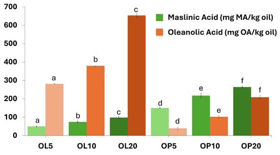 Triterpenic acid content of oils enriched with olive leaves and pomace. MA = maslinic acid; OA = oleanolic acid; OL5-OL10-OL20 and OP5-OP10-OP20 represent freshly extracted virgin avocado oil enriched with olive leaves and olive pomace, respectively, at 5, 10, and 20% (w/w) employing ultrasound-assisted maceration. Results expressed as mean value ± standard deviation (n = 3). Darker colors per used plant material indicate higher enrichment levels. Different letters above the bars indicate significant differences (p < 0.05) within samples macerated with OL and OP per compound, employing Duncan’s test.