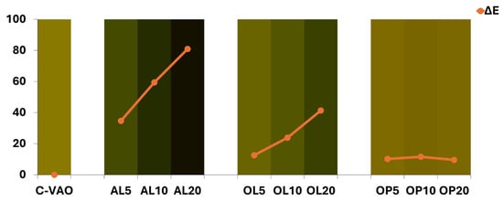 Visual appearance of the studied virgin avocado oils. Orange lines represent the color similarity (ΔΕ, mean values, n = 5) of the enriched oils with the control. C-AO = avocado oil; C-VAO = freshly extracted virgin avocado oil; AL5-AL10-AL20, OL5-OL10-OL20, and OP5-OP10-OP20 represent C-VAO enriched with avocado leaves, olive leaves, and olive pomace, respectively, at 5, 10, and 20% (w/w) employing ultrasound-assisted maceration.